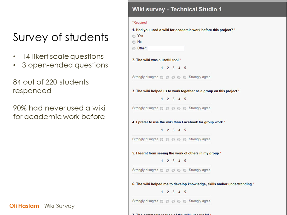 The following survey enabled first year students of architecture to give feedback on their use of wikis. It was constructed in Google Forms and embedded in Blackboard for students to complete.