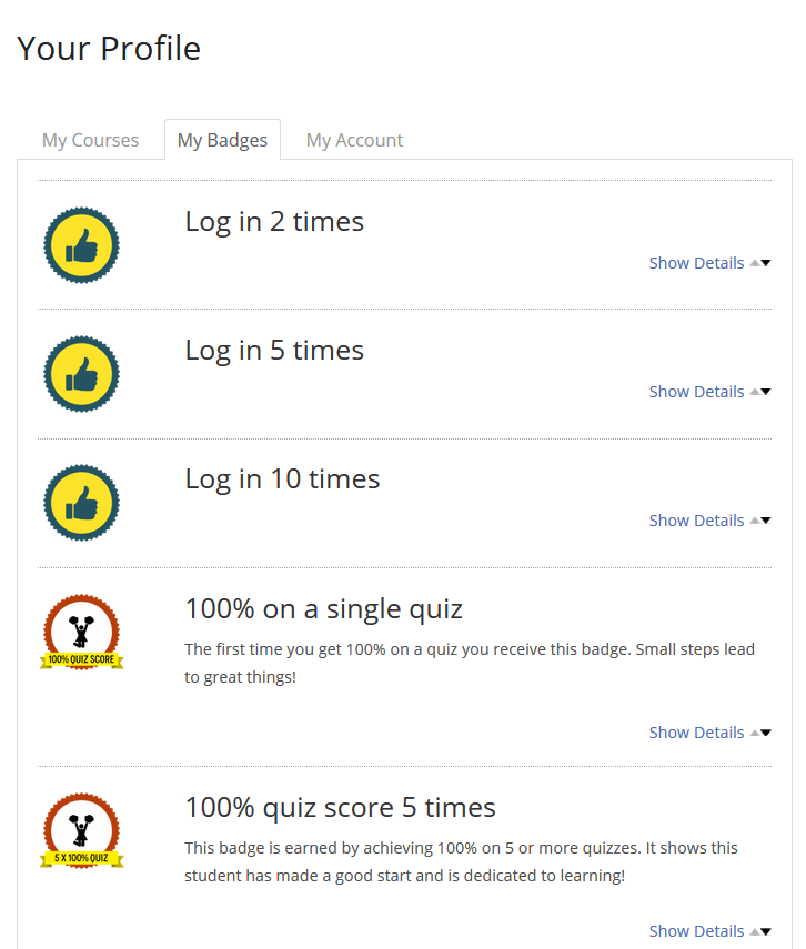 There are digital badges to reward and encourage activity in the course. Badges are triggered by actions such as logging in a specified number of times; as well as more academic activities such as completing a topic or achieving a 100% quiz score. On completion of a course learners also receive a (PDF) certificate for printing or downloading.