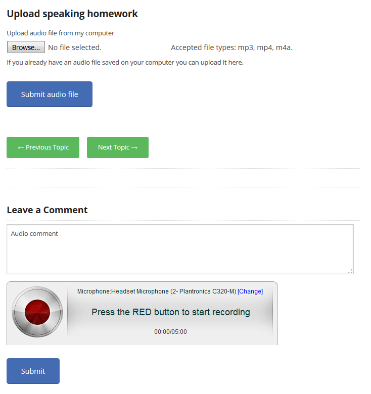 - speaking assignments (users record an audio comment on the website)